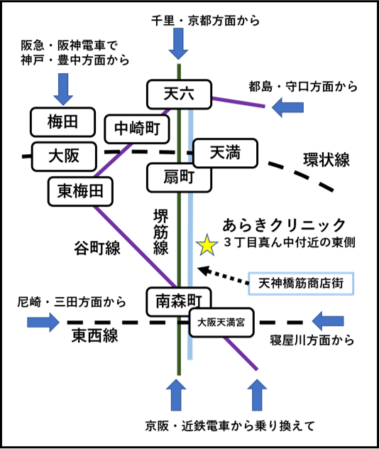 | 電車の場合 | ▶地下鉄堺筋線・谷町線「南森町」駅、JR東西線「大阪天満宮」駅3番出口から天満駅方面へ徒歩4分 ▶ JR環状線「天満」駅から天満宮方面へ徒歩6分 |